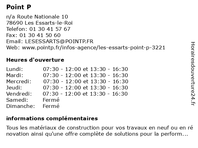 1 Point P (Distance: 7,72 km) 13 Rue François Arago, 78190 Trappes aménagement, construction, matériaux, point, point.p, quinçaillerie, équipement 2 Point P (Distance: 9,50 km) 108 Rue de la Louvière, 78120 Rambouillet aménagement, construction, matériaux, point, point.p, quinçaillerie, équipement 3 Point P (Distance: 11,79 km) n/a Route de Galluis, 78940 La Queue-les-Yvelines aménagement, construction, matériaux, point, point.p, quinçaillerie, équipement 4 Point P (Distance: 13,64 km) 3 bis Rue des Entrepreneurs, 78340 Les Clayes-sous-Bois aménagement, construction, matériaux, point, point.p, quinçaillerie, équipement 5 Point P (Distance: 17,54 km) 13 Rue Stourm, 78730 Saint-Arnoult-en-Yvelines aménagement, construction, matériaux, point, point.p, quinçaillerie, équipement 6 Point P (Salle d'Exposition) (Distance: 13,64 km) 3 bis Rue des Entrepreneurs, 78340 Les Clayes-sous-Bois aménagement, construction, d'exposition, exposition, matériaux, point, quinçaillerie, salle |