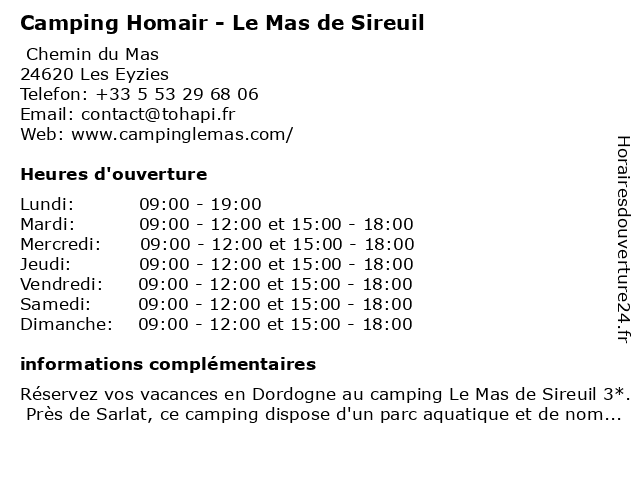 1 Camping Le Mas - Tohapi (Réception, haute saison) (Distance: 0,88 km) - sireuil, 24620 Les Eyzies De Tayac Sireuil camping, haute, hebergement, le, mas, réception, saison, tohapi, tourisme 2 Camping Le Mas - Tohapi (Réception, basse saison) (Distance: 0,88 km) - sireuil, 24620 Les Eyzies De Tayac Sireuil basse, camping, hebergement, le, mas, réception, saison, tohapi, tourisme 3 Camping Le Mas - Tohapi (Distance: 0,88 km) - sireuil, 24620 Les Eyzies De Tayac Sireuil camping, hebergement, le, mas, tohapi, tourisme 4 Camping La Noyeraie - Juillet et Août (Distance: 10,29 km) - Le Grelat, 24220 Castels et Bézenac accueil, août, camping, en, et, juillet, la, loisirs, noyeraie, tourisme, vacances 5 Camping La Noyeraie - Hors saison (Distance: 10,29 km) - Le Grelat, 24220 Castels et Bézenac accueil, camping, en, hors, la, loisirs, noyeraie, saison, tourisme, vacances 6 Camping Le Colombier (Distance: 10,29 km) - -, 24220 Castels et Bézenac camping, colombier, le, loisirs, tourisme, vacances |