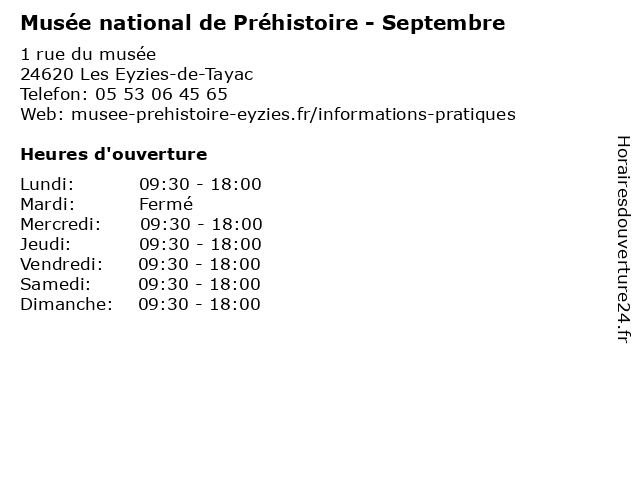 1 Musée National de Préhistoire - Octobre à Mai (Distance: 0,00 km) 1 rue du Musée, 24620 Les Eyzies-de-Tayac de, exposition, mai, musée, national, octobre, préhistoire, visite 2 Musée national de Préhistoire - Juillet et août (Distance: 0,00 km) 1 rue du musée, 24620 Les Eyzies-de-Tayac août, de, et, exposition, juillet, musée, national, préhistoire, visite 3 Abri Pataud - Mai, juin et septembre (Distance: 0,11 km) 20 rue du Moyen-Âge, 24620 Les Eyzies-de-Tayac abri, art et sépultures, et, juin, mai, pataud, septembre, vies nomades, voyage préhistorique 4 Pole Prehistoire - Du 2 mai au 30 juin et du 1er septembre au 30 septembre (Distance: 0,32 km) 30 rue du Moulin, 24620 Les Eyzies 1er, 30, ancien, art, au, chateau, du, et, exposition, histoire, juin, livre, mai, monument, musee, musée, pole, prehistoire, savoir, septembre 5 Jacquou Parc - 4 juin au 3 septembre (Distance: 6,96 km) - La Ménuse, 24260 Le Bugue attractions, au, jacquou, juin, loisirs, parc, septembre, tourisme 6 Grottes Gouffre de Proumeyssac Mars – 16 au 30 septembre – Octobre" (Distance: 7,24 km) - rue de Proumeyssac, 24260 Audrix 16, 30, au, de, gouffre, grottes, mars, octobre", proumeyssac, septembre, visite, émars |