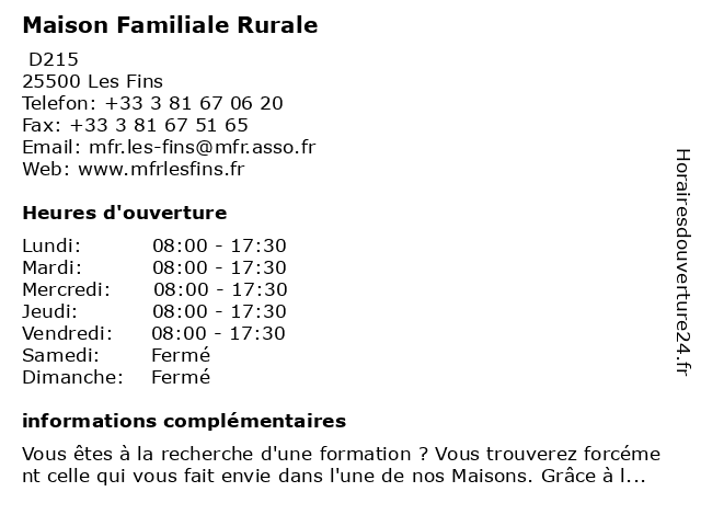 1 Maison d'Accueil Rurale Personnes Agées (Distance: 16,96 km) 7 Rue Bellevue, 25510 Pierrefontaine-les-Varans agées, d'accueil, maison, personnes, rurale 2 La Parenthese (Distance: 29,34 km) 8 Rue de Vannolles, 25300 Pontarlier boissons, cuisine, familiale, française, la, parenthese, repas, restaurant 3 France Rurale (Distance: 40,91 km) 13 Rue de Salins, 25330 Bolandoz articles de jardin, france, prodagricole charmeil alimentation animale équipement pour équitation, rurale, sellerie jardineries, végétaux 4 Centre de Planification et d'Éducation Familiale (CICS) (Distance: 49,39 km) 6 Rue de la Vieille Monnaie, 25000 Besançon centre, cics, contraception, d'éducation, de, dépistage, et, familiale, information, ou, planification, sexualité, traitement 5 Association Familiale Catholique - AFC (Distance: 49,86 km) 1 Avenue Denfert Rochereau, 25000 Besançon afc, association, bénévoles, catholique, enseignements, familiale, représentant, églises 6 Association Maison Familiale Rurale Montbozon (Distance: 51,28 km) 6 Rue du Bressot, 70230 Montbozon association, familiale, maison, montbozon, rurale |