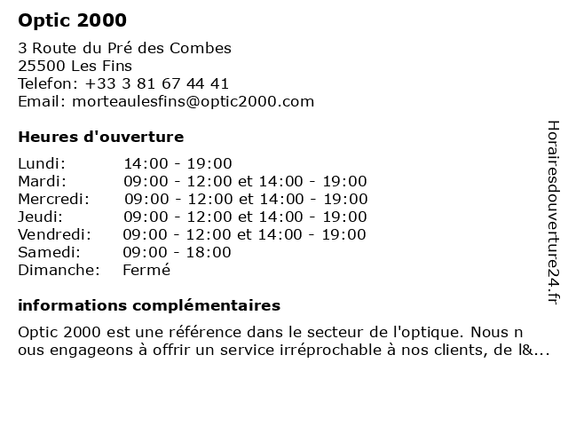 3 Opticien Maîche - Optic 2000 (Distance: 25,78 km) 16 Rue Sainte-Anne, 25120 Maîche 2000, lentilles de contact, lunettes de soleil, lunettes de vue, maîche, optic, optic2000, opticien, opticien optic2000, ray-ban, rayban 4 Opticien Doubs - Optic 2000 (Distance: 25,82 km) 1 Rue de Besançon, 25300 Doubs 2000, doubs, lentilles de contact, lunettes de soleil, lunettes de vue, optic, optic2000, opticien, opticien optic2000, ray-ban, rayban 5 Visual - Mod'Optic (Distance: 26,20 km) 7 Rue De La République, 25300 Pontarlier lentilles, lunettes, mod'optic, optique, visual 6 Opticien Pontarlier - Optic 2000 (Distance: 26,22 km) 16 Rue de la République, 25300 Pontarlier 2000, lentilles de contact, lunettes de soleil, lunettes de vue, optic, optic2000, opticien, opticien optic2000, pontarlier, ray-ban, rayban |