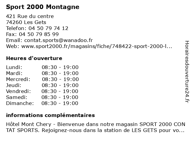 1 Sport 2000 Montagne (Distance: 0,26 km) 68 Rue du Vieux Village, 74260 Les Gets 2000, course à pied, mode, montagne, multisport, sport 2 Sport 2000 Montagne (Distance: 4,76 km) 44 Route de Morzine, 74110 Montriond 2000, course à pied, mode, montagne, multisport, sport 3 Sport 2000 Montagne (Distance: 9,04 km) 33 Promenade du festival, 74110 Avoriaz 2000, course à pied, mode, montagne, multisport, sport 4 Sport 2000 Montagne (Distance: 14,77 km) 47 Route Du Val Renand, 74300 Les Carroz-d'Araches 2000, course à pied, mode, montagne, multisport, sport 5 Sport 2000 Montagne (Distance: 16,85 km) - Flaine Foret, 74300 Flaine 2000, course à pied, mode, montagne, multisport, sport 6 Sport 2000 Montagne (Distance: 17,37 km) - route du linga, 74390 Châtel 2000, course à pied, mode, montagne, multisport, sport |