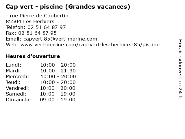 1 Cap vert - piscine (Grandes vacances) (Distance: 8,36 km) - rue Pierre de Coubertin, 85504 Les Herbiers aqua, aquatique, cap, grandes, piscine, vacances, vert 2 Cap vert - piscine (Périodes scolaires) (Distance: 0,00 km) - rue Pierre de Coubertin, 85504 Les Herbiers aqua, aquatique, cap, piscine, périodes, scolaires, vert 3 Cap vert - piscine (Petites vacances) (Distance: 0,00 km) - rue Pierre de Coubertin, 85504 Les Herbiers aqua, aquatique, cap, petites, piscine, vacances, vert 4 GAMM VERT (Distance: 1,17 km) 4 Avenue de la Maine, 85500 Les Herbiers animalerie, gamm, jardin, jardinerie, mobilier de jardin, plantes, pépinière, vert 5 Feu Vert (Distance: 1,24 km) 4 Avenue de la Maine, 85500 Les Herbiers amortisseurs, ampoule, autoradio, batterie, chaussettes neige, chaînes neige, coffre de toit, feu, freinage, glacière, pneu, pneu 4 saisons, pneu hiver, remorque, révision, vert, vidange 6 |