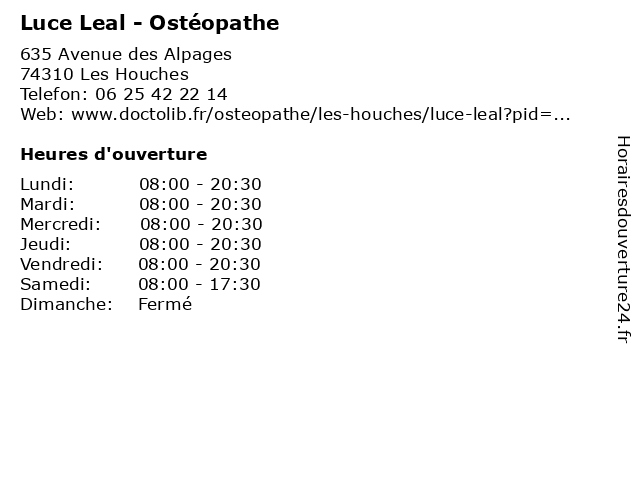 | 1 Luce Mangani - Masseur-kinésithérapeute (Distance: 54,41 km) 100 Route de Genève, 74350 Allonzier-la-Caille kiné, kinésithérapeute, luce, mangani, masseur, rééducation, soin 2 Maître Jérôme Luce - Avocat (Distance: 55,02 km) 2 Rue Alfred Bastin, 74100 Annemasse avocat, avocats, civils, droits, juridiques, jérôme, luce, maître 3 Luce Leal - Ostéopathe (Distance: 55,24 km) - Passage Sainte-Geneviève, 73220 Aiguebelle leal, luce, ostéo, ostéopathe, ostéopathes, soins 4 Bio Market - Accord Bio (Distance: 0,18 km) 804 Avenue des Alpages, 74310 Les Houches accord, alimentation, bio, diététique, epicerie, fruits, hiver, légumes, market, nature, pain, soins, thé, été 5 Aurélie Maizieres - Ostéopathe (Distance: 0,32 km) 301 Avenue des Alpages, 74310 Les Houches aurélie, maizieres, ostéo, ostéopathe, ostéopathes, soins 6 Alison Boutier - Ostéopathe (Distance: 0,91 km) 47 Impasse du Nant Fresnay, 74310 Les Houches alison, boutier, osteo, osteopathe, ostéopathe, sante, soins |