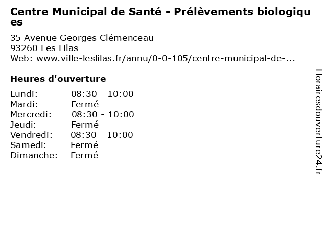 1 Centre Municipal de Santé (Distance: 0,00 km) 35 Avenue Georges Clémenceau, 93260 Les Lilas bureau, centre, consultation, de, dr, maladie, med, municipal, médecin, médecine, pratique, santé, thérapie, traitement 2 Centre Municipal de Santé - Soins de kinésithérapie sur rendez-vous (Distance: 0,00 km) 35 Avenue Georges Clémenceau, 93260 Les Lilas bureau, centre, consultation, de, dr, kinésithérapie, maladie, med, municipal, médecin, médecine, pratique, rendez, santé, soins, sur, thérapie, traitement, vous 3 Centre Municipal de Santé - Gynécologie (Distance: 0,00 km) 35 Avenue Georges Clémenceau, 93260 Les Lilas bureau, centre, consultation, de, dr, gynécologie, maladie, med, municipal, médecin, médecine, pratique, santé, thérapie, traitement 4 Centre Municipal de Santé - Ophtalmologie (Distance: 0,00 km) 35 Avenue Georges Clémenceau, 93260 Les Lilas bureau, centre, consultation, de, dr, maladie, med, municipal, médecin, médecine, ophtalmologie, pratique, santé, thérapie, traitement 5 Centre Municipal de Santé - Dermatologie (Distance: 0,00 km) 35 Avenue Georges Clémenceau, 93260 Les Lilas bureau, centre, consultation, de, dermatologie, dr, maladie, med, municipal, médecin, médecine, pratique, santé, thérapie, traitement 6 Centre Municipal de Santé - Psychiatrie adulte, adolescent (Distance: 0,00 km) 35 Avenue Georges Clémenceau, 93260 Les Lilas adolescent, adulte, bureau, centre, consultation, de, dr, maladie, med, municipal, médecin, médecine, pratique, psychiatrie, santé, thérapie, traitement |