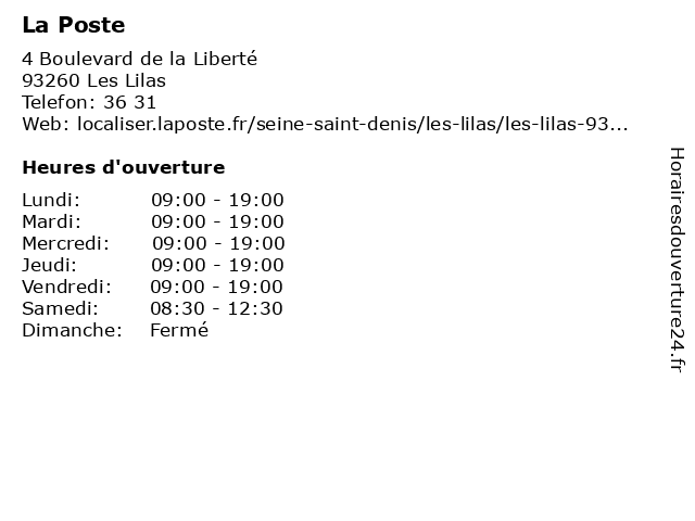 2 La Poste (Distance: 1,80 km) 31 Rue de la République, 93230 Romainville colis, express chronopost, expédition, la, poste, réexpédition internationale, service, suivi du courrier 3 La Poste (Distance: 2,92 km) 64 Avenue Edouard Vaillant, 93500 Pantin electronic store, la, poste, services, store 4 La Poste (Distance: 3,62 km) 27 Bis Rue des Laitières, 94300 Vincennes colis, express chronopost, expédition, la, poste, réexpédition internationale, service, suivi du courrier 6 La Poste (Distance: 4,12 km) 18 Avenue du Château, 94300 Vincennes colis, express chronopost, expédition, la, poste, réexpédition internationale, service, suivi du courrier |