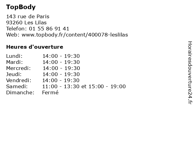 1 TopBody (Distance: 3,58 km) 79 ter Boulevard de Picpus, 75012 Paris bien etre, machines, musculation, nutrition, topbody 2 Topbody (Distance: 7,83 km) 26 rue Léon Jost, 75017 Paris accessoires, chaussures, nutrition, sportive, topbody 3 Bsa Shop (Distance: 0,00 km) 143 rue de Paris, 93260 Les Lilas bien etre, bsa, machines, musculation, shop 4 Les Pergolas (Distance: 0,27 km) 74 Rue de Paris, 93260 Les Lilas bien-etre, les, massages, pergolas, relax, sante 5 Hangar Fitness - Les Lilas (Distance: 0,33 km) - Rue Jean Moulin, 93260 Les Lilas cardio, club, fitness, hangar, les, lilas, musculation, pilates, yoga 6 Frédéric Viaux - Massages Bien-Etre (Distance: 0,82 km) 69 Rue Haxo, 75020 Paris bien, bien-entre, etre, frédéric, kiné, massages, masseur, relaxation, santé, thérapies, viaux |