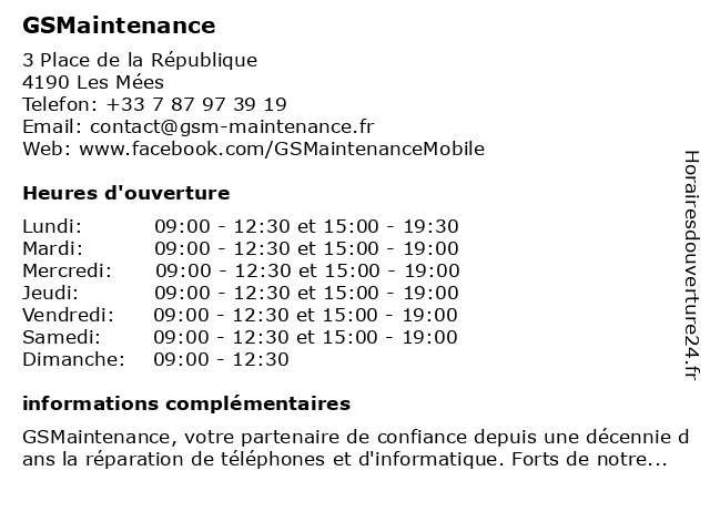 1 GSMaintenance (Distance: 0,01 km) 2 Place de la République, 04190 Les Mées gsmaintenance, réparation de console, réparation de mobile, réparation de téléphone, réparation ordinateur, réparation téléphone mobile 04, vente de mobile, vente de téléphone, vente et reparation de telephones mobiles, vente et reparation jeux video neufs et occasions, vente reparation de materiels informatiques neufs et d'occasion 2 GSMaintenance (Distance: 0,01 km) 2 place de la République, 04190 Les Mées dépannage, gsmaintenance, mobile, réparation, tablette, vente |