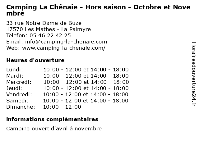 1 Camping La Chênaie - Juillet et Août (Distance: 0,00 km) 33 rue Notre Dame de Buze, 17570 Les Mathes août, camping, chênaie, en, et, juillet, la, loisirs, réception, tourisme, vacances 2 Camping La Chênaie - Basse saison (Distance: 0,00 km) 33 rue Notre Dame de Buze, 17570 Les Mathes - La Palmyre avril, basse, camping, chênaie, en, et, juin, la, loisirs, mai, réception, saison, septembre, tourisme, vacances 3 Zoo La Palmyre - Du 1er octobre au 31 mars (Distance: 4,52 km) 6 Avenue de Royan Les Mathes, 17570 Les Mathes 1er, 31, ancien, art, au, chateau, du, et, exposition, histoire, la, livre, mars, monument, musee, musée, octobre, office, palmyre, zoo 4 Office de Tourisme - Octobre à Mars (Distance: 4,88 km) 1 Boulevard Pasteur, 17390 La Tremblade de, divers, détail, magasins, mars, municipal, nra, octobre, office, tourisme 5 Azureva Village vacances - Avril à octobre (Distance: 8,18 km) 17 Avenue des Erables, 17390 La Tremblade avril, azureva, hebergement, octobre, vacances, village 6 Office de Tourisme - octobre (Distance: 9,39 km) 5 route de Plordonnier, 17113 Mornac Sur Seudre de, horaires des musées, octobre, office, restaurants, tourisme, transports |