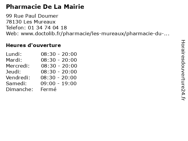 1 Pharmacie de La Mairie (Distance: 0,00 km) 99 Rue Paul Doumer, 78130 Les Mureaux de, la, mairie, pharmacie 2 Pharmacie de la Mairie (Distance: 10,92 km) 23 Rue de l'Abondance, 95800 Cergy conseils, de, la, mairie, matériel, médical, médicaments, parapharmacie, pharmacie, soins 3 Pharmacie De La Mairie (Distance: 14,41 km) 78 Route de Houdan, 78711 Mantes-la-Ville de, la, mairie, pharmacie 4 Pharmacie de la Mairie (Distance: 15,48 km) 6 Avenue du Général de Gaulle, 95310 Saint-Ouen-l'Aumône conseils, de, la, mairie, matériel, médical, médicaments, parapharmacie, pharmacie, soins 5 Pharmacie De La Mairie (Distance: 17,93 km) 34 Avenue de Longueil, 78600 Maisons-Laffitte de, la, mairie, pharmacie 6 Dr. Jean Marc Benoist - Chirurgie viscérale (Horaires de consultation sur rendez-vous centre de consultations gresillons 1/2 (Distance: 25,97 km) 67 avenue Foch, 92250 La Garenne-Colombes 1/2, benoist, centre, chirurgie, consultation, consultations, de, docteur, dr., gresillons, horaires, jean, marc, medecins, rendez, santé, sur, viscérale, vous |