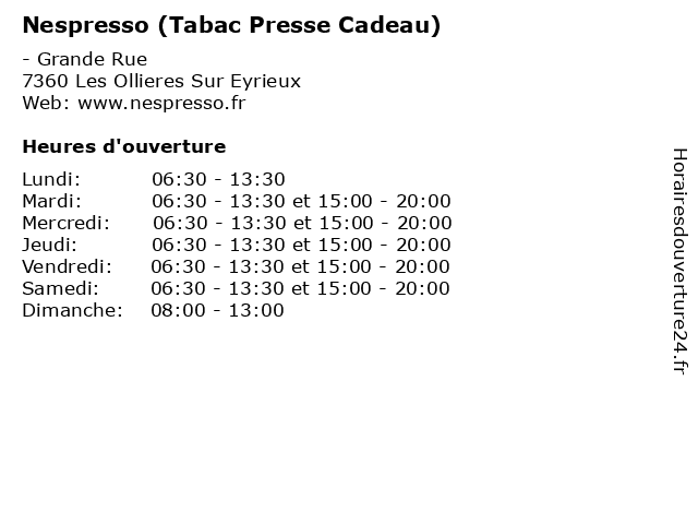 1 Tabac Presse (Distance: 3,37 km) 390 Grande Avenue, 07360 Les Ollières-sur-Eyrieux bar, cigarette, fdj, journaux, presse, tabac 2 Maison de La Presse (Distance: 9,77 km) - Place Victor Hugo, 07000 Privas cadeaux, carterie, confiserie-boissons-food, de, française des jeux, la, librairie, maison, papeterie, pmu, presse, tabac 3 Tabac Le Louisiane (Distance: 12,68 km) 1 place des platanes, 07210 Alissas alimentation, brasserie, le, louisiane, parking, restaurant, tabac, terrasse 4 Nespresso (Vival) (Distance: 15,16 km) 12 Avenue Marcel Nicolas, 07250 Le Pouzin accessories, coffee, machines, nespresso, points de recyclage, services, vival 5 Relais Colis® / TABAC PRESSE MERLE (Distance: 15,17 km) 10 Rue Marcel Nicolas, 07250 Le Pouzin colis, colis®, merle, presse, relais, services postaux et de livraison, tabac 6 Maison de La Presse (Distance: 15,52 km) - Rue De L'hotel De Ville, 07160 Le Cheylard cadeaux, carterie, confiserie-boissons-food, de, française des jeux, la, librairie, maison, papeterie, pmu, presse, tabac |