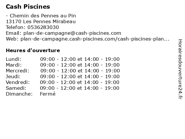 1 Cash Piscines (Distance: 13,71 km) 41 Bis Rue Sainte Eugène, 30700 Uzes accessoires, cash, constructeur, magasin, piscines, pisciniste, produits 2 Piscines Desjoyaux - Ô2 Provence Piscines - Eté (Distance: 0,99 km) 2 Rue de Lisbonne, 13480 Cabriès de, desjoyaux, eté, fitness, iti, musculation, piscines, provence, salle, sport, vai, Ô2, été 3 Carter-Cash (Distance: 1,09 km) - Avenue Victor Mellan, 13170 Les Pennes-Mirabeau automobile, carter, cash, magasin, pièces détachées, pneus 4 Piscines Desjoyaux - Ô2 Provence Piscines - Hiver) (Distance: 1,12 km) - Parc Expobat, Plan de Campagne, 13480 Cabries de, desjoyaux, fitness, hiver, iti, musculation, piscines, provence, salle, sport, vai, Ô2 5 Cash Express (Distance: 1,15 km) n/a Avenue du Plan de Campagne, 13480 Cabries achat, bijoux, cash, d'achats, express, franchise, salle, vente 6 Cash Converters (Distance: 5,70 km) 11 Avenue saint Antoine, 13015 Marseille boutique, cash, converters, multimédia, électroménagerm |