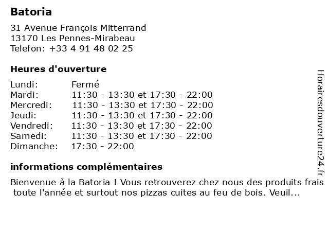 Bienvenue à la Batoria ! Vous retrouverez chez nous des produits frais toute l'année et surtout nos pizzas cuites au feu de bois. Veuillez nous contacter pour plus d'informations.