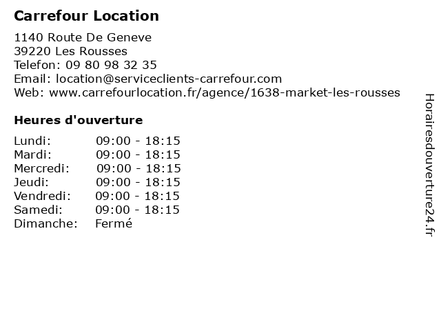 1 Carrefour Location (Distance: 5,75 km) - Chemin de la Brunette, 01210 Ferney Voltaire automobiles, carrefour, déménagements, location, véhicules 2 Carrefour Location (Distance: 7,42 km) 25 Avenue Florissant, 74100 Annemasse accessoires, beaute&sante, cafe, carrefour, chaussures, enfants, location, mode femmes, mode hommes, optique, photo, restaurant, service, sport 3 Carrefour Location (Distance: 11,14 km) - Route Nationale 5, 01170 Segny automobiles, carrefour, déménagements, location, véhicules 4 Carrefour Location (Distance: 12,68 km) 210 Route De Bersat, 74930 Reignier-Ésery agence, carrefour, location, utilitaires, véhicules 5 Carrefour Location (Distance: 19,29 km) - Route De Thonon, 74140 Douvaine agence, carrefour, location, utilitaires, véhicules 6 Carrefour Location (Distance: 19,84 km) 629 Route D’Annecy, 74350 Cruseilles agence, carrefour, location, utilitaires, véhicules |