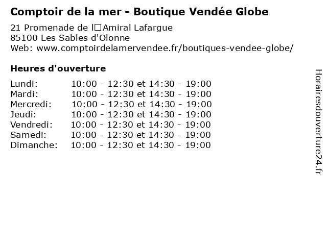 | Samedi | 10:00-12:30 et 14:30-19:00 |