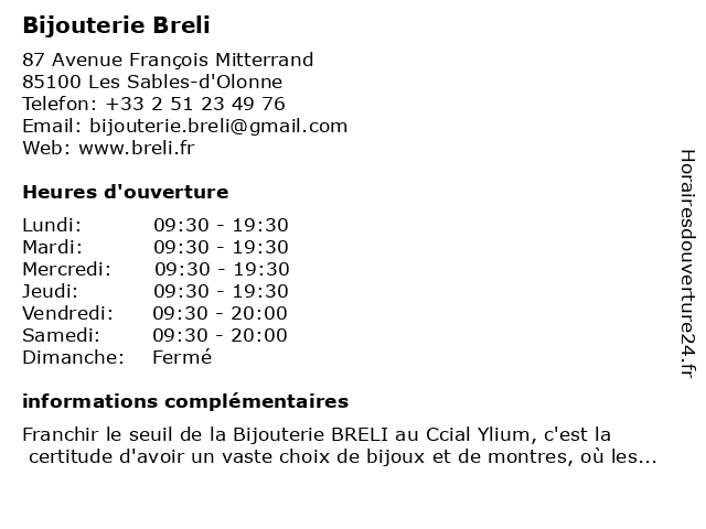 2 Bijouterie Ultim (Distance: 3,97 km) 4 Avenue du Maréchal Juin, 85180 Le Château-d'Olonne bijouterie, ultim 4 Bijouterie Breli (Distance: 34,11 km) - Route de Nantes, 85000 La Roche-Sur-Yon bijouterie, bijoux, breli, horlogerie, montre 5 Julien D'Orcel (Distance: 0,95 km) 87 Avenue François Mitterrand, 85340 Les Sables-d'Olonne bijouterie, d'orcel, diamants, julien, montres, or 6 Eurodif (Distance: 32,01 km) 12-14 Place du Marché, 85000 La Roche-sur-Yon bijouterie, décoration, eurodif, mobilier |