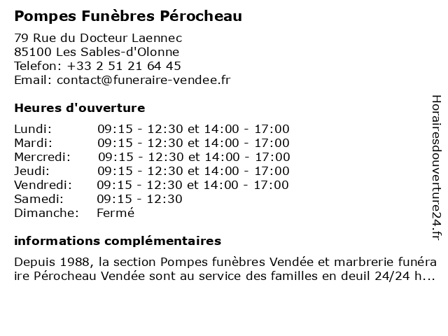 1 Pompes Funèbres Pérocheau (Distance: 16,05 km) 28 Avenue Napoléon Bonaparte, 85150 Les Achards funèbres, pompes, pérocheau 2 Pompes funèbres PFG LES SABLES-D'OLONNE (Distance: 0,66 km) 40 Avenue Jean Jaurès, 85100 Les Sables-d'Olonne avis de décès, crémation, d'olonne, entretien de sépulture, fleurs deuil, formalités après obsèques, funèbres, inhumation, les, marbrerie, monument funéraire, pfg, pompes, pompes funèbres, prévoyance obsèques, sables 3 Pompes funèbres Les Sables d'Olonne - La Maison des Obsèques - Ets Lemarchand (Distance: 0,99 km) 71 Avenue Charles de Gaulle, 85340 Les Sables-d'Olonne d'olonne, des, ets, funèbres, la, lemarchand, les, maison, obsèques, pompes, sables 4 Pompes funèbres de Vendée Entreprise familiale (Distance: 2,65 km) 214 Avenue François Mitterrand, 85340 Les Sables-d'Olonne de, entreprise, familiale, funèbres, pompes, vendée 5 Pompes funèbres Talmont Saint Hilaire - La Maison des Obsèques - Ets Lemarchand (Distance: 11,05 km) 288 Avenue des Sables, 85440 Talmont-Saint-Hilaire des, ets, funèbres, hilaire, la, lemarchand, maison, obsèques, pompes, saint, talmont 6 Pompes Funèbres Talmondaises (Distance: 13,09 km) 403 Avenue de Luçon, 85440 Talmont-Saint-Hilaire funèbres, pompes, talmondaises |