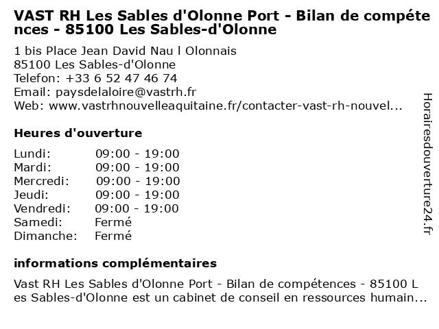 1 Vast RH Les Sables d'Olonne Port - Bilan de compétences - 85100 Les Sables-d'Olonne (Distance: 1,28 km) 1 bis Promenade de l'Amiral Lafargue, 85100 Les Sables-d'Olonne 85100, bilan, compétences, d'olonne, de, les, port, rh, sables, vast 2 Restaurant Le Port (Distance: 0,68 km) 24 Quai George V, 85100 Les Sables d'Olonne le, poissons, port, restaurant, salades, traditionnel, viandes 3 Onepark / Port de pêche Parking (Distance: 0,97 km) - Quai Ernest de Franqueville, 85100 Les Sables-d'Olonne de, onepark, parking, port, pêche, services 4 ORIENTACTION les Sables d'Olonne - Bilan de compétences (Distance: 2,36 km) 12 Rue des Tournesols, 85340 Les Sables-d'Olonne bilan, compétences, d'olonne, de, les, orientaction, sables 5 Vast RH Les Sables d'Olonne - Bilan de compétences - 85100 Les Sables d'Olonne (Distance: 3,10 km) 114 Rue des Nouettes, 85100 Les Sables-d'Olonne 85100, bilan, compétences, d'olonne, de, les, rh, sables, vast 6 ORIENTACTION Les Sables-d'Olonne - Bilan de compétences - 1er rendez-vous gratuit et sans engagement. (Distance: 4,46 km) 2 Impasse des jumeaux, 85340 Les Sables-d'Olonne 1er, bilan, compétences, d'olonne, de, engagement., et, gratuit, les, orientaction, rendez, sables, sans, vous |