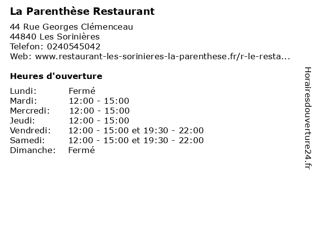 | Samedi | 12:00-15:00 et 19:30-22:00 |
