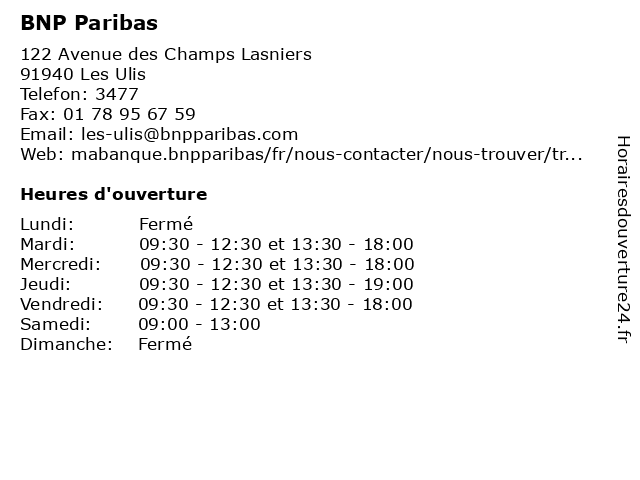 1 BNP Paribas (Distance: 1,50 km) 55 rue Charles de Gaulle, 91440 Bures-Sur-Yvette agence, argent, assurance, bancaire, banque, bnp, depot, paribas, transfert 2 BNP Paribas (Distance: 1,72 km) 3 Place de la République, 91400 Orsay agence, argent, assurance, bancaire, banque, bnp, depot, paribas, transfert 3 BNP Paribas (Distance: 4,05 km) 19 avenue de la Vauve, 91120 Palaiseau banques, bnp, commerciales, livret, nationales, paribas, épargne 4 BNP Paribas (Distance: 4,07 km) 11 Place du du Marché Neuf, 91190 Gif-sur-Yvette agence, argent, assurance, bancaire, banque, bnp, depot, paribas, transfert 5 BNP Paribas (Distance: 6,71 km) 20 Rue Pierre Lescot, 91430 Igny agence, argent, assurance, bancaire, banque, bnp, depot, paribas, transfert 6 BNP Paribas (Distance: 8,74 km) 1 Résidence les Arcades, 91160 Longjumeau agence, argent, assurance, bancaire, banque, bnp, depot, paribas, transfert |
