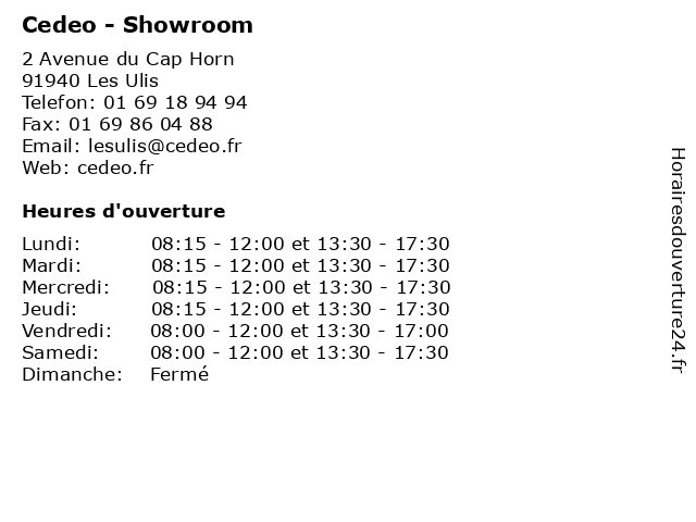 1 Cedeo - Showroom (Distance: 13,77 km) 11 Rue de la Porte de Buc, 78000 Versailles cedeo, chauffage, climatisation, informations, le, outils, plomberie, sanitaire, showroom, sur, électricité, équipements 2 Cedeo - Showroom (Distance: 15,54 km) 27 Rue Albert Joly, 78000 Versailles cedeo, chauffage, climatisation, informations, le, outils, plomberie, sanitaire, showroom, sur, électricité, équipements 3 Cedeo (Distance: 0,00 km) 2 Avenue du Cap Horn, 91940 Les Ulis cedeo, chauffage, climatisation, informations, l'agence, outils, plomberie, sanitaire, sur, électricité, équipements 4 Cedeo (Informations sur le showroom) (Distance: 11,41 km) 17 Avenue des Froides Bouillies, 91420 Morangis cedeo, heating materials, informations, le, plumbing, showroom, sur 5 Cedeo (Distance: 13,06 km) 2 Route des Fresnes, 69400 Arnas cedeo, chauffage, magasins, plomberie, services 6 Cedeo (Distance: 13,47 km) 17-25 Rue Victor Basch, 91170 Viry Châtillon cedeo, chauffage, climatisation, outillage, plomberie, sanitaire |