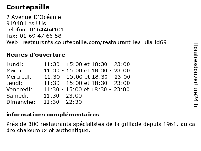 1 Courtepaille (Distance: 5,56 km) . Route Du Golf, 91190 Saint-Aubin courtepaille, européens, restaurants, services 3 Courtepaille (Distance: 8,03 km) 9 Chemin du vieux pavé de bruyères, 91310 Linas courtepaille, restaurant français 4 Courtepaille (Distance: 8,05 km) 9 Chemin Du Vieux Pavé, 91310 Linas courtepaille, européens, restaurants, services 5 Courtepaille (Distance: 10,05 km) 1 Rue Charaintru, 91360 Épinay-sur-Orge courtepaille, européens, restaurants, services 6 Courtepaille (Distance: 10,08 km) 1a Rue charaintru, 91360 Epinay Sur Orge courtepaille, restaurant français |