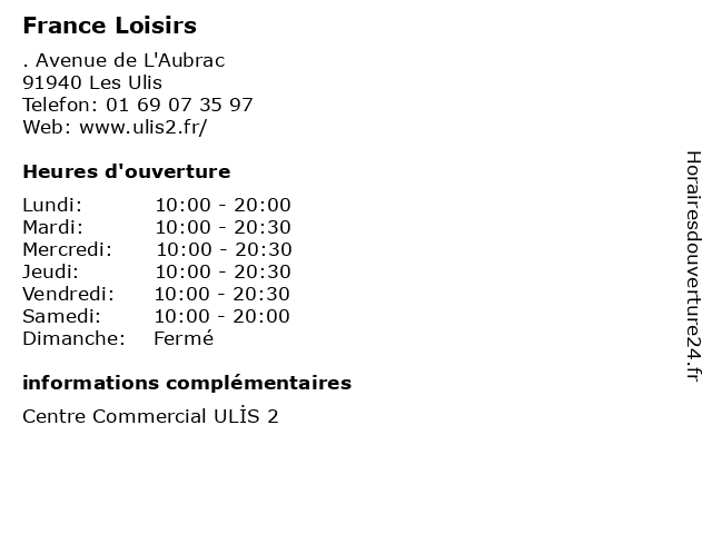 | Mercredi | 10:00-20:30 |