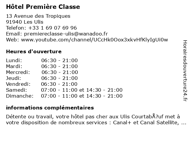 1 Hotel Premiere Classe (Distance: 0,00 km) n/a Avenue des tropiques, 91955 Les Ulis classe, hotel, petit dejeuner, premiere, restaurant 2 Hotel Premiere Classe (Distance: 5,81 km) 12 Rue Maryse Bastie, 91430 Igny bar, chambres, classe, hotel, premiere, restaurant, service 3 Hotel Premiere Classe (Distance: 6,25 km) . Allee St Fiacre, 91620 La Ville Du Bois bar, chambres, classe, hotel, premiere, restaurant, service 4 Hotel Premiere Classe (Distance: 7,79 km) . Route De Longjumeau, 91380 Chilly Mazarin bar, chambres, classe, hotel, premiere, restaurant, service 5 Hotel Premiere Classe (Distance: 12,53 km) . La Greffiere, 91700 Fleury Merogis bar, chambres, classe, hotel, premiere, restaurant, service 6 Hotel Premiere Classe Orly Rungis (Distance: 13,43 km) 18 Rue du Pont des Halles, 94150 Rungis bar, chambres, classe, hotel, orly, premiere, restaurant, rungis |