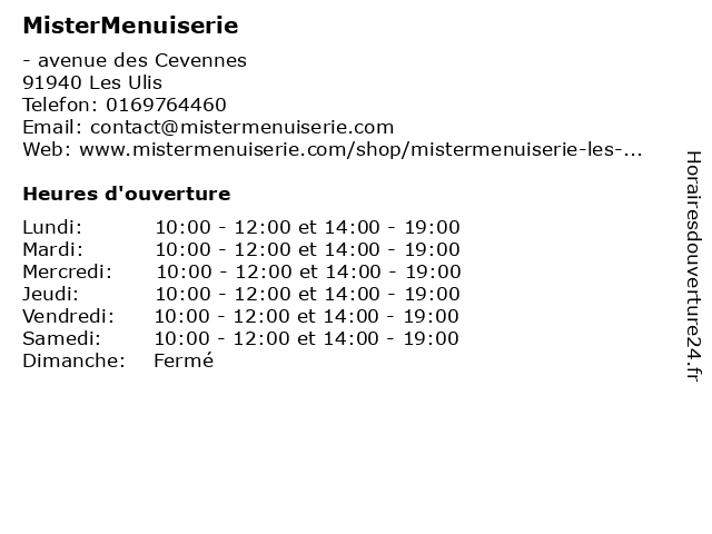 | Mercredi | 10:00-12:00 et 14:00-19:00 |