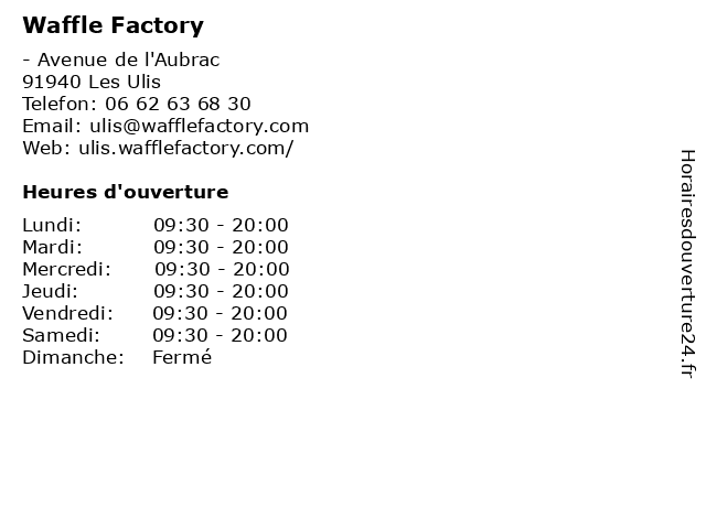 1 Waffle Factory (Distance: 7,54 km) . chemin Croix Saint-Jacques, 91620 La ville-du-Bois boissons, brasserie, factory, gauffres, idf, restaurants, waffle, wf 2 Waffle Factory (Distance: 9,72 km) 20 Route Nationale, 91620 La Ville Du Bois cafe, chaussures, enfants, factory, homme, mode femme, restaurant, service, waffle 3 Waffle Factory (Distance: 11,56 km) . Avenue de l’Europe, 78140 Velizy-Villacoublay beaute, cafe, chaussures, enfants, factory, lingerie, mode femmes, mode hommes, restaurant, sport, waffle 4 Waffle Factory (Distance: 11,56 km) 2 Avenue de l’Europe, 78140 Vélizy-Villacoublay desserts., factory, restauration, waffle 5 Waffle Factory (Distance: 15,17 km) 5 Rue Colbert, 78180 Montigny-le-Bretonneux boissons, brasserie, factory, gauffres, idf, restaurants, waffle, wf 6 Waffle Factory (Distance: 17,22 km) - avenue du Luxembourg, 94531 Thiais boissons, brasserie, factory, gauffres, idf, restaurants, waffle, wf |