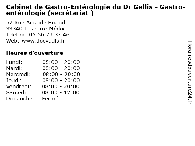 1 Dr. Olivier Gellis - Gastro-entérologie (Distance: 0,00 km) 57 Rue Aristide Briand, 33340 Lesparre Médoc consultation, docteur, dr., entérologie, gastro, gellis, olivier, santé 2 Cabinet de cardiologie Docteur Tarascon (secrétariat ) (Distance: 0,00 km) 57 Rue Aristide Briand, 33340 Lesparre cabinet, cardiologie, consultation, de, docteur, médecins, santé, secrétariat, tarascon 3 CAB Cabinet Expertise Comptable et de Commissariat aux Comptes (Distance: 0,33 km) 6 Route de Bordeaux, 33340 Lesparre-Médoc aux, cab, cabinet, commissariat, comptable, comptes, de, et, expertise 4 Cabinet des Dr Gradinaru, Klila et Stora à Lesparre Médoc - Gynécologie Accouchements (Distance: 0,35 km) - Rue Aristide Briand, 33340 Lesparre accouchements, cabinet, consultation, des, docteur, dr, et, gradinaru, gynécologie, klila, lesparre, médoc, santé, stora 5 Cabinet Vétérinaire Médico-Chirurgical (Dr Caruel Louis) (Distance: 0,38 km) 9 avenue de Bordeaux, 33340 Lesparre-médoc cabinet, caruel, chirurgical, dr, louis, medicales, médico, services, veterinaires, vétérinaire 6 Cabinet d'endocrinologie - Lesparre- Endocrinologie (secrétariat ) (Distance: 6,16 km) - du Médoc, 33340 Lesparre cabinet, consultation, d'endocrinologie, docteur, endocrinologie, lesparre, santé, secrétariat |