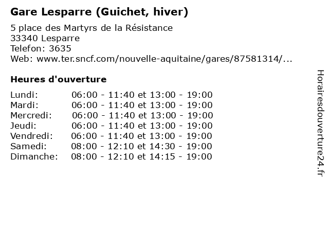 1 Gare Lesparre (Guichet, Ete) (Distance: 0,00 km) 5 place des Martyrs de la Résistance, 33340 Lesparre ete, gare, gares, guichet, lesparre, servises, station 2 Gare Lesparre (Hiver) (Distance: 0,00 km) 5 place des Martyrs de la Résistance, 33340 Lesparre gare, gares, hiver, lesparre, servises, station 3 Gare Lesparre (Ete) (Distance: 0,00 km) 5 place des Martyrs de la Résistance, 33340 Lesparre ete, gare, gares, lesparre, servises, station 4 Gare Pauillac (Guichet) (Distance: 18,59 km) 2 place de Verdun, 33250 Pauillac gare, gares, guichet, pauillac, servises, station 5 Gare Pauillac (Gare) (Distance: 18,59 km) 2 place de Verdun, 33250 Pauillac gare, gares, pauillac, servises, station 6 Gare Macau (Guichet) (Distance: 41,84 km) s/n avenue de la gare, 33460 Macau gare, gares, guichet, macau, servises, station |