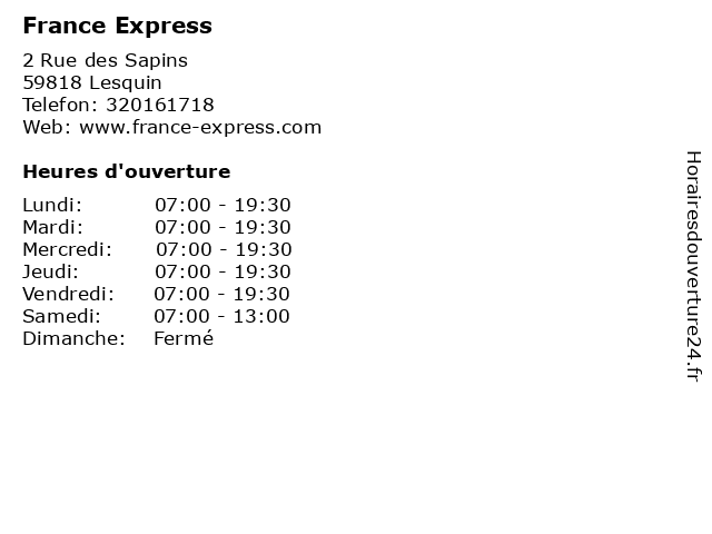 2 France Express (Heures limites de dépôt) (Distance: 0,00 km) 2 Rue des Sapins, 59818 Lesquin de, dépôt, express, france, heures, limites, poste, services, transporteur 3 Federal Express International (Distance: 1,29 km) , Lille Lesquin, 59819 Lesquin Cedex express, federal, hold express package at location for pickup, international 4 Carrefour Express (Distance: 2,28 km) 272 Rue du Maréchal Leclerc, 59262 Sainghin-en-Mélantois alimentation, carrefour, express, magasin discount, market, supermarché 5 ESSO EXPRESS (Distance: 6,81 km) 72 AV DU PRESIDENT KENNEDY, 59000 LILLE air tower, des, esso, express, fuel. gasoline, truck pumps, unleaded, vending machines 6 ESSO EXPRESS (Distance: 7,28 km) , RUE DE LA COUTURE, 59290 Wasquehal air tower, des, esso, express, fuel. gasoline, truck pumps, unleaded, vending machines |