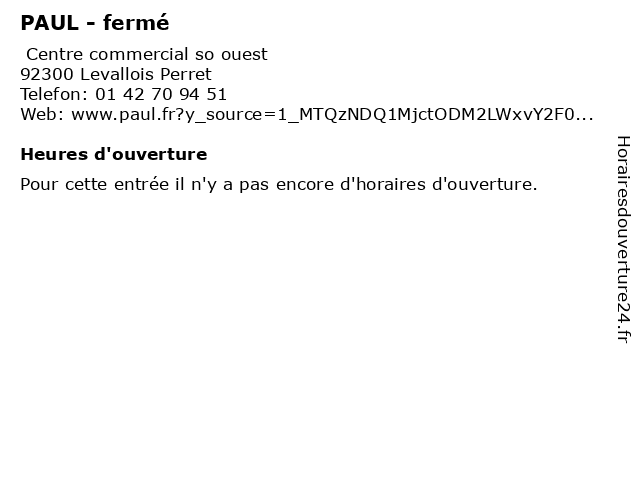 1 PAUL - fermé (Distance: 1,61 km) 18 Avenue des ternes, 75017 Paris boulangeries, boutique de desserts, café, fermé, paul, restaurant à emporter 2 PAUL - fermé (Distance: 2,75 km) 13 Rue lepic, 75018 Paris boulangeries, boutique de desserts, café, fermé, paul, restaurant à emporter 3 PAUL - fermé (Distance: 4,50 km) 12 Rue de dunkerque gare paris nord, 75010 Paris boulangeries, boutique de desserts, café, fermé, paul, restaurant à emporter 4 PAUL - fermé (Distance: 5,36 km) 106 Rue De Rennes, 75006 Paris boulangeries, boutique de desserts, café, fermé, paul, restaurant à emporter 5 Fermé - Kusmi Tea | Avenue Niel | Paris 17ème (Distance: 1,16 km) 75 Avenue niel, 75017 Paris 17ème, avenue, boutique de cadeaux, fermé, kusmi, niel, paris, tea 6 Dr. Jean-Paul Allart - Gynecologie (Distance: 1,81 km) 5 Square du Roule, 75008 Paris allart, consultation, docteur, dr., gynecologie, jean, paul, santé |