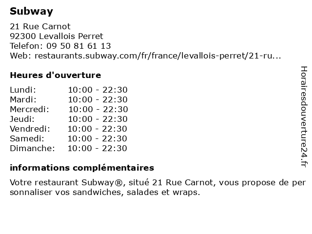 1 Subway (Distance: 2,08 km) 14 Avenue de Villiers, 75017 Paris cuisine, rapide, restaurant, restauration, sandwiches, subway 2 Subway (Distance: 2,90 km) 6 Rue de Laborde, 75008 Paris cuisine, rapide, restaurant, restauration, sandwiches, subway 4 Subway (Distance: 3,19 km) 58 Rue de La Pompe, 75016 Paris cuisine, rapide, restaurant, restauration, sandwiches, subway 5 Subway (Distance: 3,94 km) 5 Boulevard de Grenelle, 75015 Paris cuisine, rapide, restaurant, restauration, sandwiches, subway 6 |