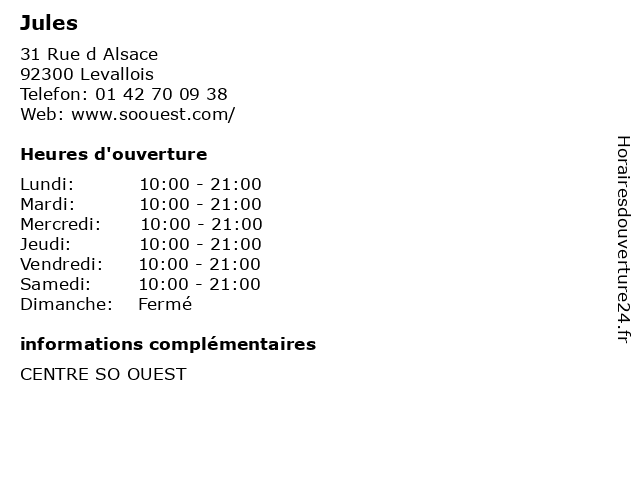 1 Jules (Distance: 4,10 km) 64 RUE DE PASSY, 75016 PARIS accessoires, chemises, jules, pulls, sweats, t-shirts 2 Jules (Distance: 4,66 km) 101 Porte Berger, 75045 Paris chaussures, jules, lingerie, mode enfant, mode femmes, mode hemmes, sport 3 Jules (Distance: 5,91 km) 23 Rue Madeleine Vionnet, 93300 Aubervilliers alimentation, beauté & sante, culture & loisirs, enfants, high-tech, jules, maison & déco, mode, restaurants 4 Jules (Distance: 6,59 km) 50 Avenue du Maréchal Foch, 95100 Argenteuil beaute, cafe, chaussures, enfants, jules, lingerie, mode femmes, mode hommes, restaurant, sport 5 Jules (Distance: 7,87 km) - Centre, 95290 L'ISLE ADAM accessoires, chemises, jules, pulls, sweats, t-shirts 6 Jules (Distance: 9,56 km) . De La Vache Noire, 94110 Arcueil cafe, chaussures, enfants, homme, jules, lingerie, mode femme, restaurant |