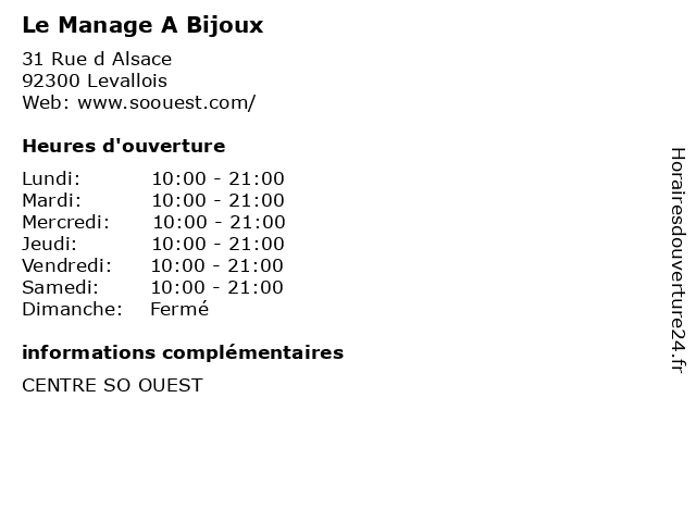 1 E.Leclerc Manège A Bijoux (Distance: 0,27 km) 98-102 rue Jean Jaurès, 92300 Levallois Perret bijoutier, bijoux, création de bijoux, e.leclerc, magasin de montres, manège, réparation de montres 4 Bijoux Catherine Fabre (Distance: 2,32 km) 102 Avenue des Champs Elysées, 75008 Paris bijou, bijouterie, bijoux, boutique, catherine, fabre, joaillerie, sportif, thémes 5 Manage & Co (Distance: 2,97 km) 9 Rue de Clichy, 75009 Paris and, carriere, co, gestion, manage, manage and co, notion, paris, sports 6 Gas Bijoux (Distance: 3,00 km) 8 Avenue George V, 75008 Paris accessoires, bagues, bijouterie, bijoux, bracelets, cadeaux, chaînes, gas |