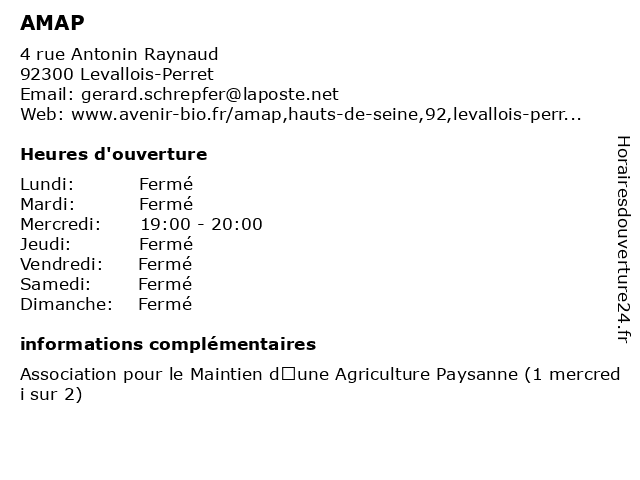 1 AMAP (Distance: 3,32 km) 3 rue de Belgique, 92270 Bois-Colombes amap, bio, fruits, légumes, primeur, producteur 2 AMAP (Distance: 7,08 km) 52 rue de Billancourt, 92100 Boulogne-Billancourt amap, bio, fruits, légumes, primeur, producteur 3 AMAP (Distance: 9,16 km) 70 avenue de la Marne, 92120 Montrouge amap, bio, fruits, légumes, primeur, producteur, viande 4 AMAP (Distance: 11,60 km) 25 rue de la Lisette, 92220 Bagneux amap, bio, fruits, légumes, primeur, producteur, viande 5 AMAP des Batignolles (Distance: 1,90 km) 84 rue Mstislav Rostroprovitch, 75017 Paris alimentation, amap, batignolles, des, fruits, légumes, primeurs, producteur, viandes 6 AMAP des Brunelles (Distance: 2,02 km) 21bis rue d'Armaillé, 75017 Paris alimentation, amap, brunelles, des, fruits, légumes, primeurs, producteur, viandes |