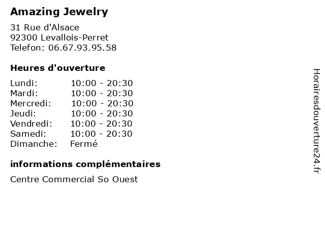 1 Amazing Jewelry (Distance: 4,29 km) 4 Boulevard Gallieni, 92390 Villeneuve-la-Garenne accessoires, amazing, bijouterie, bijoux, cadeaux, jewelry, montres 2 Naya Jewelry (Distance: 2,50 km) 11 Avenue De La Liberté, 92400 Courbevoie création de bijoux, jewelry, naya 3 Amazing Beauty (Distance: 4,70 km) 90 Rue Riquet, 75018 Paris amazing, balayage, beauty, brushing, coiffeur, coiffure, coloration, coupe 4 MARIA TASH | Fine Jewelry & Luxury Piercing (Distance: 5,03 km) Le Bon Marché, 75007 Paris bijouterie, fine, jewelry, luxury, magasin de perçage corporel, maria, piercing, tash 5 Histoire d'Or (Distance: 0,02 km) Rue Gustave Eiffel, 92300 Levallois-Perret bijoutier, création de bijoux, d'or, gravures sur bijoux, histoire, magasin de montres, négociant en or, réparation de bijoux, réparation de montres 6 Tempka (Distance: 0,13 km) 16 Rue de Lorraine, 92300 Levallois accessoires, bijouterie, bijoux, maroquinerie, montres, tempka |