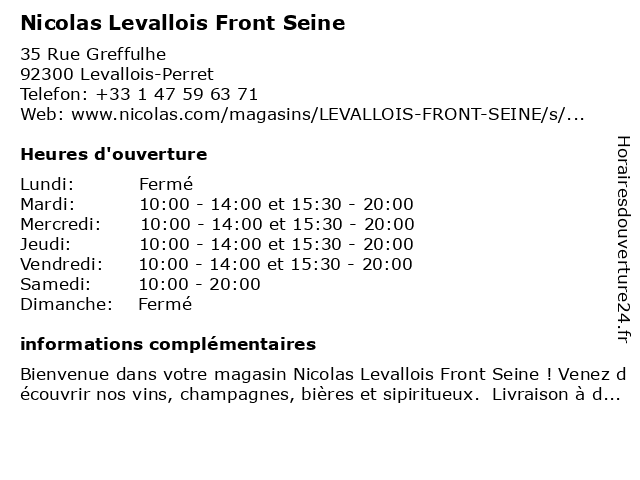 1 Nicolas (Distance: 0,01 km) 35 Rue Greffulhe, 92300 Levallois Perret champagnes, hyper-supermarchés, nectars, nicolas, vente au détail de vin, vin 2 Conseil Départemental des Hauts-de-Seine (Distance: 3,31 km) 57 Rue des Longues Raies, 92000 Nanterre administration, assoc, conseil, de, des, départemental, hauts, seine, services, services publics 3 Hotel Eiffel Seine (Distance: 4,65 km) 3 Boulevard de Grenelle, 75015 Paris bar, chambres, eiffel, hotel, restaurant, seine 4 Le Manège De Côté Seine (Distance: 5,69 km) 50 Avenue du Maréchal Foch, 95100 Argenteuil beaute, cafe, chaussures, côté, de, enfants, le, lingerie, manège, mode femmes, mode hommes, restaurant, seine, sport 5 Caisse d'Allocations Familiales (CAF) des Hauts-de-Seine (Distance: 6,51 km) 70-88 Rue Paul Lescop, 92000 Nanterre accueil, allocations, caf, caisse, d'allocations, de, des, familiales, hauts, nanterre, seine 6 Communauté de Communes d'agglomération Coeur-de-Seine (Distance: 7,06 km) 13 Place Charles-de-Gaulle, 92211 Saint-Cloud administration, coeur, communauté, communes, d'agglomération, de, seine, services publics |