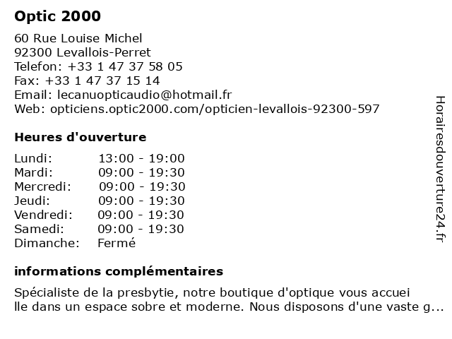 1 Optic 2000 (Distance: 0,01 km) 60 Rue Louise Michel, 92300 Levallois-Perret 2000, lunettes, optic, santé, solaires 3 Optic 2000 (Distance: 2,31 km) 101 Avenue de Clichy, 75017 Paris 2000, lunettes, optic, santé, solaires 4 Optic 2000 (Distance: 2,61 km) 37 Rue Saint Didier, 75016 Paris 2000, lunettes, optic, santé, solaires 5 Optic 2000 (Distance: 2,68 km) 16 Rue des Belles Feuilles, 75116 Paris 2000, accessoires, beaute&sante, cafe, chaussures, enfants, mode femmes, mode hommes, optic, optique, restaurant, service, sport 6 |