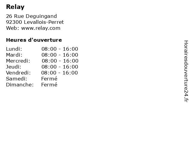 1 Relay (Distance: 0,13 km) 55 Rue Deguingand, 92300 Levallois-Perret beverages, food, gifts, paper, printing, relay, service products, telephone 2 Relay (Distance: 1,12 km) n/a Porte de Clichy, 75017 Paris beverages, food, gifts, paper, printing, relay, service products, telephone 3 Relay (Distance: 1,83 km) 63 Boulevard Victor Hugo, 92200 Neuilly-sur-Seine beverages, food, gifts, paper, printing, relay, service products, telephone 4 Relay (Distance: 2,19 km) , Charles de Gaule Etoile, 75017 Paris beverages, books in original, e-readers, ebooks, food, large format books, pocket books, printing, relay, service products, variety of kiosk articles 5 Relay (Distance: 2,79 km) 13 Rue d'Amsterdam, 75008 Paris cafe, chaussures, enfants, homme, mode femme, relay, restaurant, service, sport 6 Relay (Distance: 3,48 km) . Place du 11 novembre 1918, 75010 Paris cafe, chaussures, enfants, homme, lingerie, mode femme, relay, restaurant, service, shopping |