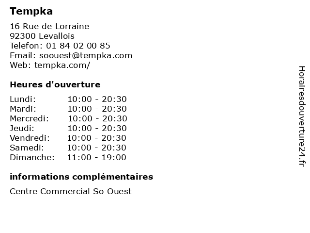 1 Tempka (Distance: 2,73 km) 1 Cour de Rome, 75008 Paris accessoires, article, femme, homme, mode, relojeria, tempka 2 Tempka (Distance: 4,04 km) 11/13 Rue Basse, 75001 Paris accessoires, bijouterie, bijoux, marques, montres, tempka 3 Tempka (Distance: 4,13 km) 15 Parvis de la Défense, 92092 Paris La Défense accessoires, bijouterie, bijoux, maroquinerie, montres, tempka 4 Tempka (Distance: 4,51 km) 4 Boulevard Gallieni, 92390 Villeneuve-la-Garenne accessoires, bijouterie, bijoux, cadeaux;tempka, montres, tempka 5 Tempka (Distance: 4,69 km) 101 Porte Berger, 75045 Paris chaussures, lingerie, mode enfant, mode femmes, mode hemmes, sport, tempka 6 Tempka (Distance: 9,54 km) . De La Vache Noire, 94110 Arcueil cafe, chaussures, enfants, homme, lingerie, mode femme, restaurant, tempka |