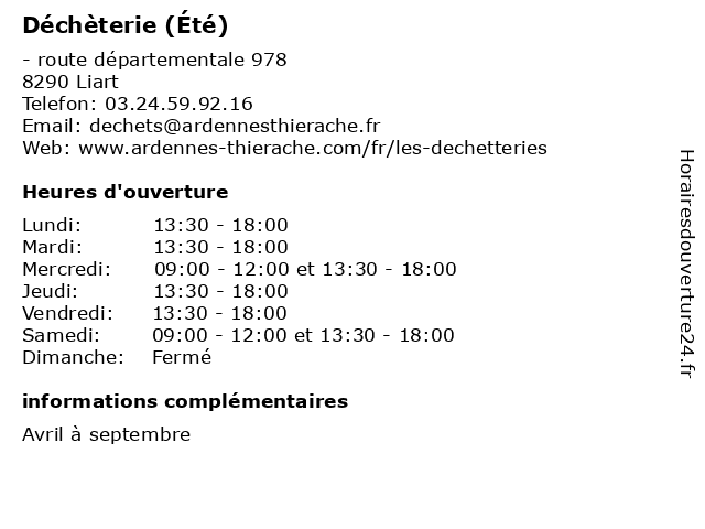 1 Déchèterie (Hiver) (Distance: 0,00 km) - route départementale 978, 08290 Liart débarras, déchets, déchèterie, hiver, mars, octobre, poubelles 2 Déchèterie (Hiver) (Distance: 6,05 km) - Route de Rocquigny, 08220 Chaumont-Porcien débarras, déchets, déchèterie, hiver, mars, octobre, poubelles 3 Déchèterie (Eté) (Distance: 6,05 km) - Route de Rocquigny, 08220 Chaumont-Porcien avril, débarras, déchets, déchèterie, eté, poubelles, septembre 4 Déchèterie (Hiver) (Distance: 13,06 km) n/c Route de Signy l'Abbaye, 08460 Thin-le-Moutier débarras, déchets, déchèterie, hiver, mars, octobre, poubelles 5 Déchèterie (Eté) (Distance: 13,06 km) n/c Route de Signy l'Abbaye, 08460 Thin-le-Moutier avril, débarras, déchets, déchèterie, eté, poubelles, septembre 6 Déchèterie (Hiver) (Distance: 13,27 km) - lieu-dit Pont d'Any, 08380 Neuville-lez-Beaulieu débarras, déchets, déchèterie, hiver, mars, octobre, poubelles |