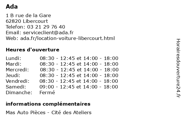 1 Ada (Distance: 2,22 km) - Rue Gutenberg, 62230 Carvin ada, agence, location, services, utilitaires, voitures, voyages 2 Ada (Distance: 13,02 km) 491 Avenue du Maréchal Leclerc, 59500 Douai ada, camions, fourgonnettes, location de voiture, monospace, services, véhicules, véhicules utilitaires 3 Ada (Distance: 13,23 km) s/n Route de l'Aéroport, 59810 LILLE ada, agences, location, utilitaire, voiture 4 Ada (Distance: 13,71 km) 42 route d'Arras, 62300 Lens ada, agence, location, services, utilitaires, voitures, voyages 5 Ada (Distance: 13,91 km) 42 Route d'Arras, 62300 Lens ada, camions, fourgonnettes, location de voiture, monospace, services, véhicules, véhicules utilitaires 6 ADA (Distance: 14,39 km) 230 Avenue roger Salengro, 59450 Sin Le Noble ada, auto, location de voiture, roulez, vehicules |