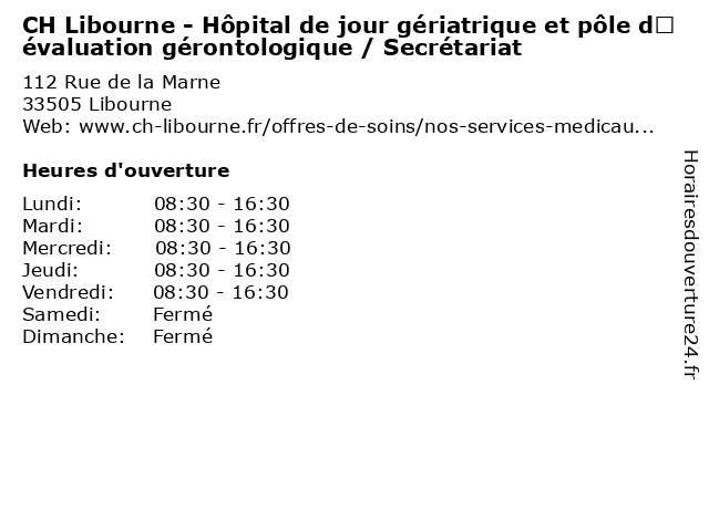 1 CH Libourne - Hôpital de jour gériatrique et pôle d’évaluation gérontologique / Secrétariat (Distance: 2,49 km) 70 Rue Réaux, 33500 Libourne bureau, ch, consultation, de, dr, d’évaluation, et, gériatrique, gérontologique, hôpital, jour, libourne, maladie, med, médecin, médecine, pratique, pôle, secrétariat, thérapie 2 CH Libourne - Dermatologie Vénérologie / Secrétariat (Distance: 0,00 km) 112 Rue de la Marne, 33505 Libourne bureau, ch, consultation, dermatologie, dr, libourne, maladie, med, médecin, médecine, pratique, secrétariat, thérapie, traitement, vénérologie 3 CH Libourne - Dermatologie Vénérologie / Consultations (Distance: 0,00 km) 112 Rue de la Marne, 33505 Libourne bureau, ch, consultation, consultations, dermatologie, dr, libourne, maladie, med, médecin, médecine, pratique, thérapie, traitement, vénérologie 4 CH Libourne - Dermatologie Vénérologie / Visites (Distance: 0,00 km) 112 Rue de la Marne, 33505 Libourne bureau, ch, consultation, dermatologie, dr, libourne, maladie, med, médecin, médecine, pratique, thérapie, traitement, visites, vénérologie 5 CH Libourne - Néphrologie / Consultations (Distance: 0,00 km) 112 Rue de la Marne, 33505 Libourne bureau, ch, consultation, consultations, dr, libourne, maladie, med, médecin, médecine, néphrologie, pratique, thérapie, traitement 6 CH Libourne - Néphrologie / Visites (Distance: 0,00 km) 112 Rue de la Marne, 33505 Libourne bureau, ch, consultation, dr, libourne, maladie, med, médecin, médecine, néphrologie, pratique, thérapie, traitement, visites |