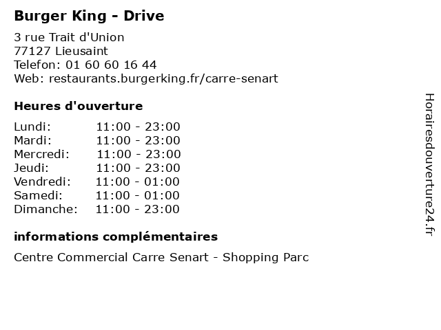 1 Burger King - Drive (Distance: 16,18 km) 2 avenue Aristide Briand, 91550 Paray-Vieille-Poste burger, burgers, desserts, drive, frites, king, restaurant, restauration rapide, salades, salle 2 Burger King - Drive (Distance: 19,42 km) 85 route de Provins, 94430 Chennevières-sur-Marne américain, burger, drive, fast, food, king, rapide, restaurant, restauration, sandwichs 3 Burger King (Distance: 0,17 km) Zac Du Carré, 77127 Lieusaint bar & gril, burger, king, restaurant américain, restaurant de hamburgers, restaurant familial, restaurant à emporter 4 Carrefour Drive (Distance: 0,69 km) - Allee Du Preambule, 77127 Lieusaint alimentaire, carrefour, courses, drive, en ligne, magasin 5 Burger King - Salle (Distance: 0,70 km) 3 allée du Préambule, 77127 Lieusaint américain, burger, burgers, fast, food, hamburger, king, menus, rapide, restaurant, restauration, salle 6 |