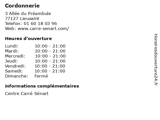 1 La Cordonnerie (Distance: 0,47 km) 3 Allée du Préambule, 77127 Lieusaint carre, centre, commercial, cordonnerie, la, lieusaint, senart 2 Cordonnerie-Clés (Distance: 7,98 km) . Route de Villoison, 91814 Corbeil beaute, cafe, chaussures, clés, cordonnerie, enfants, hommes, lingerie, mode femmes, restaurant, sport 3 Cordonnerie Clés (Distance: 7,98 km) . Route de Villoison, 91100 Villabé chemises, clés, cordonnerie, mode, robes, vêtements 4 Cordonnerie / Pressing Sermi 2 Multiservices (Distance: 8,71 km) 2 Boulevard de l'Europe, 91022 Evry centre, commercial, cordonnerie, evry, multiservices, pressing, regional, sermi 6 Cordonnerie de Montgeron (Distance: 13,27 km) 72 avenue Jean Jaurès, 91230 Montgeron chaussure, clés, cordonnerie, de, gravure, montgeron, reproduction, réparation |