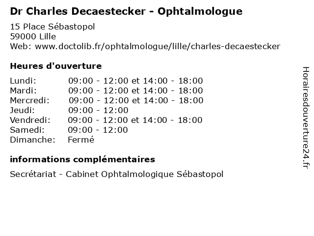1 Dr Charles Decaestecker - Ophtalmologue (Distance: 2,75 km) 69 Rue de la Louvière, 59042 Lille charles, consultation, decaestecker, docteur, dr, med, médecin, ophtalmologue, traitement 2 Dr Hugues Courteville - Ophtalmologue (Distance: 0,00 km) 15 Place Sébastopol, 59000 Lille courteville, dr, hugues, ophtalmologie, ophtalmologistes, ophtalmologue, vision 3 Dr Bertrand Herbinet - Ophtalmologue (Distance: 0,00 km) 15 Place Sébastopol, 59000 Lille bertrand, dr, herbinet, ophtalmologie, ophtalmologistes, ophtalmologue, vision 4 Dr Claude Signolles - Ophtalmologue (Distance: 0,00 km) 15 Place Sébastopol, 59000 Lille claude, dr, ophtalmologie, ophtalmologistes, ophtalmologue, signolles, vision 5 Dr Charles Pasquesoone - Ophtalmologue (Distance: 0,00 km) 15 Place Sébastopol, 59000 Lille charles, dr, ophtalmologie, ophtalmologistes, ophtalmologue, pasquesoone, vision 6 Dr Cristina Leroy - Ophtalmologue (Distance: 0,00 km) 15 Place Sébastopol, 59000 Lille cristina, dr, leroy, ophtalmologie, ophtalmologistes, ophtalmologue, vision |