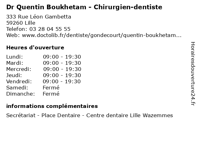 1 Dr Quentin Boukhetam - Chirurgien-dentiste (Distance: 1,66 km) 24 Rue du Molinel, 59000 Lille boukhetam, chirurgie, chirurgien, dentaire, dentiste, dr, quentin 2 Dr Frédéric Quentin - Médecin généraliste (Distance: 1,43 km) 101 rue Esquermoise, 59800 Lille consultation, docteur, dr, frédéric, générale, généraliste, libre, médecin, médecine, quentin, santé 4 Dr Quentin Daquet - Chirurgien-dentiste (Distance: 1,62 km) 70 Rue de Douai, 59000 Lille chirurgien, chirurgien-dentiste, daquet, dentiste, dr, médecins, médicaments, quentin, santé, secrétariat, spécialiste 5 Dr Quentin Lemaire - Anesthésiste réanimateur (Distance: 1,98 km) - Rue Michel Polonowski, 59037 Lille anesthésie, anesthésiste, anesthésistes, dr, huriez, hôpital, lemaire, quentin, réanimateur, réanimateurs 6 Maître Quentin Mycinski - Avocat (Distance: 2,08 km) 36 rue de Jemmapes, 59000 Lille avocat, avocats, civils, droits, juridiques, maître, mycinski, quentin |